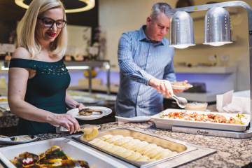 Na našem bohatém rautu si skutečně vybere každý. Připravujeme i pokrmy vhodné pro hosty s dietními omezeními, včetně bezlepkových variant, které jsou k dispozici každý den.