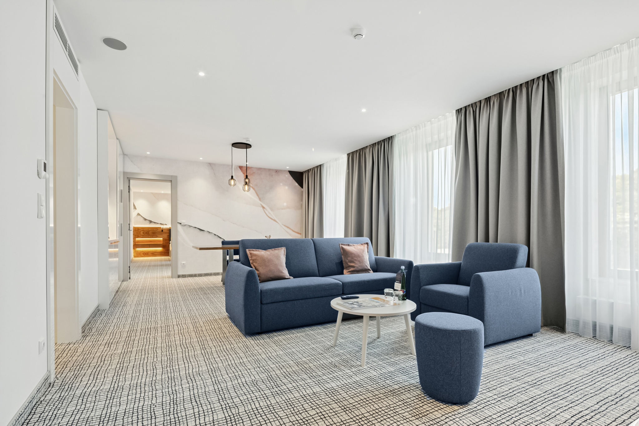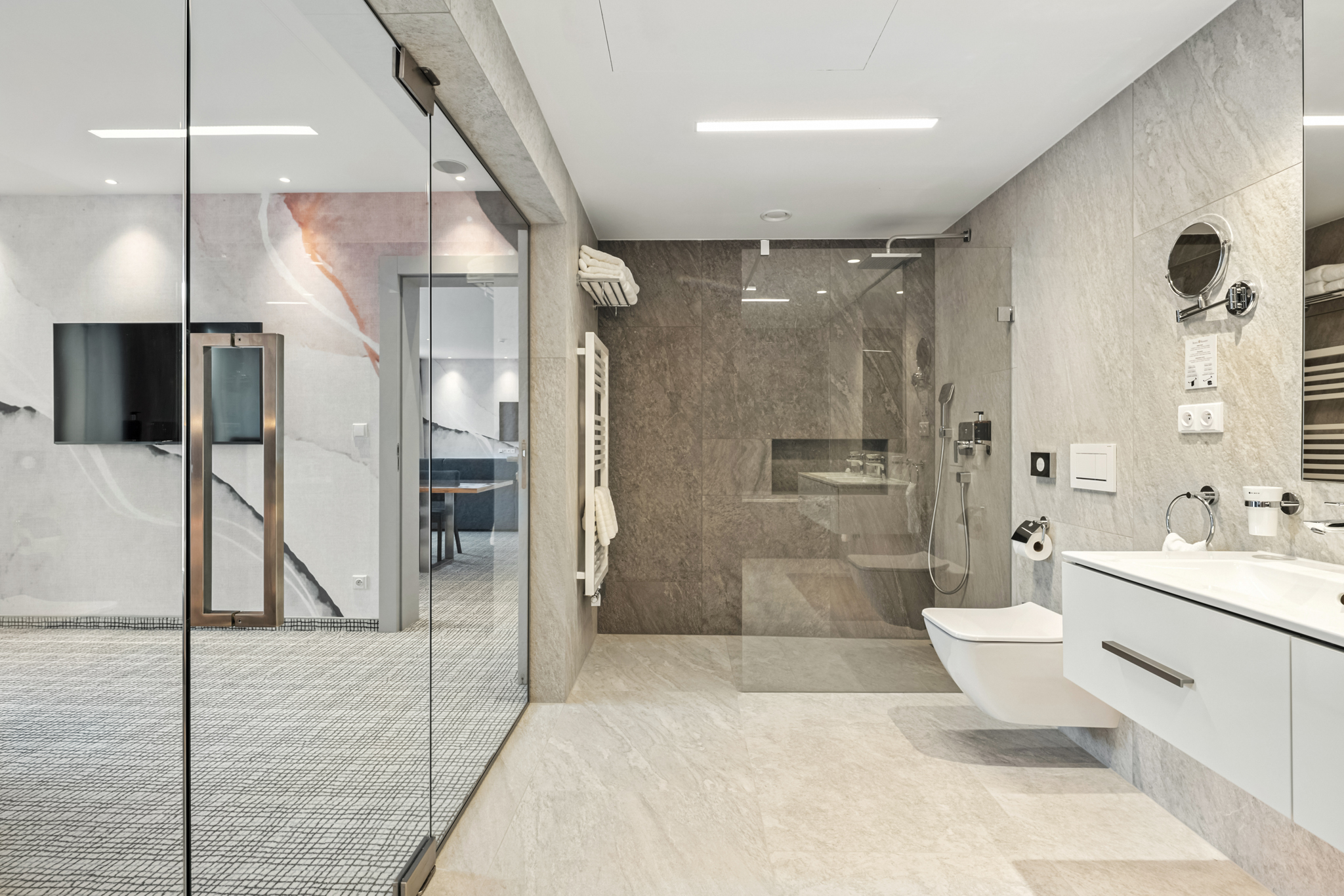 Každé apartmá je vybaveno prostornou postelí o rozměrech 200 × 200 cm a nabízí možnost plnohodnotné a velmi komfortní přistýlky. Koupelna zahrnuje vanu, oddělené WC a poskytuje maximální pohodlí.