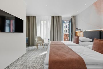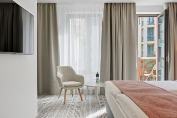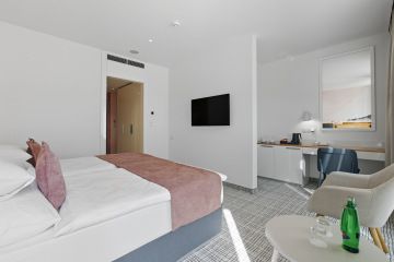 Luxusní jednolůžkový klimatizovaný pokoj o rozloze minimálně 28 m², který nabízí pohodlí a styl v každém detailu. Pokoje jsou vybaveny prostornou postelí o rozměrech 200 × 200 cm pro dokonalý odpočinek.