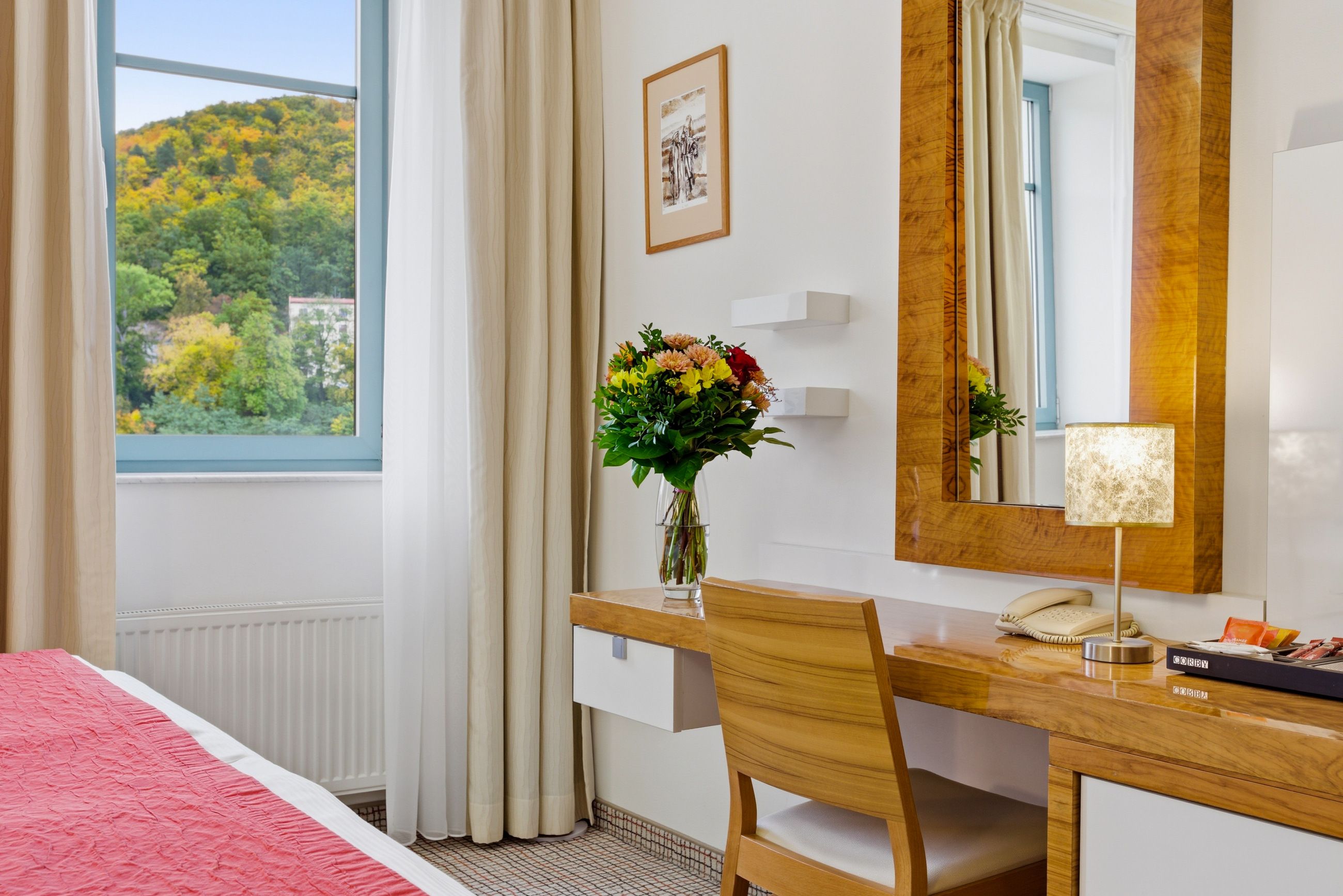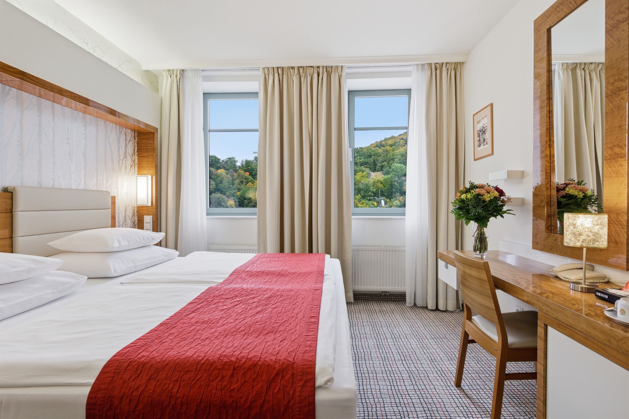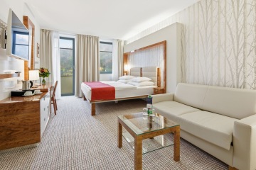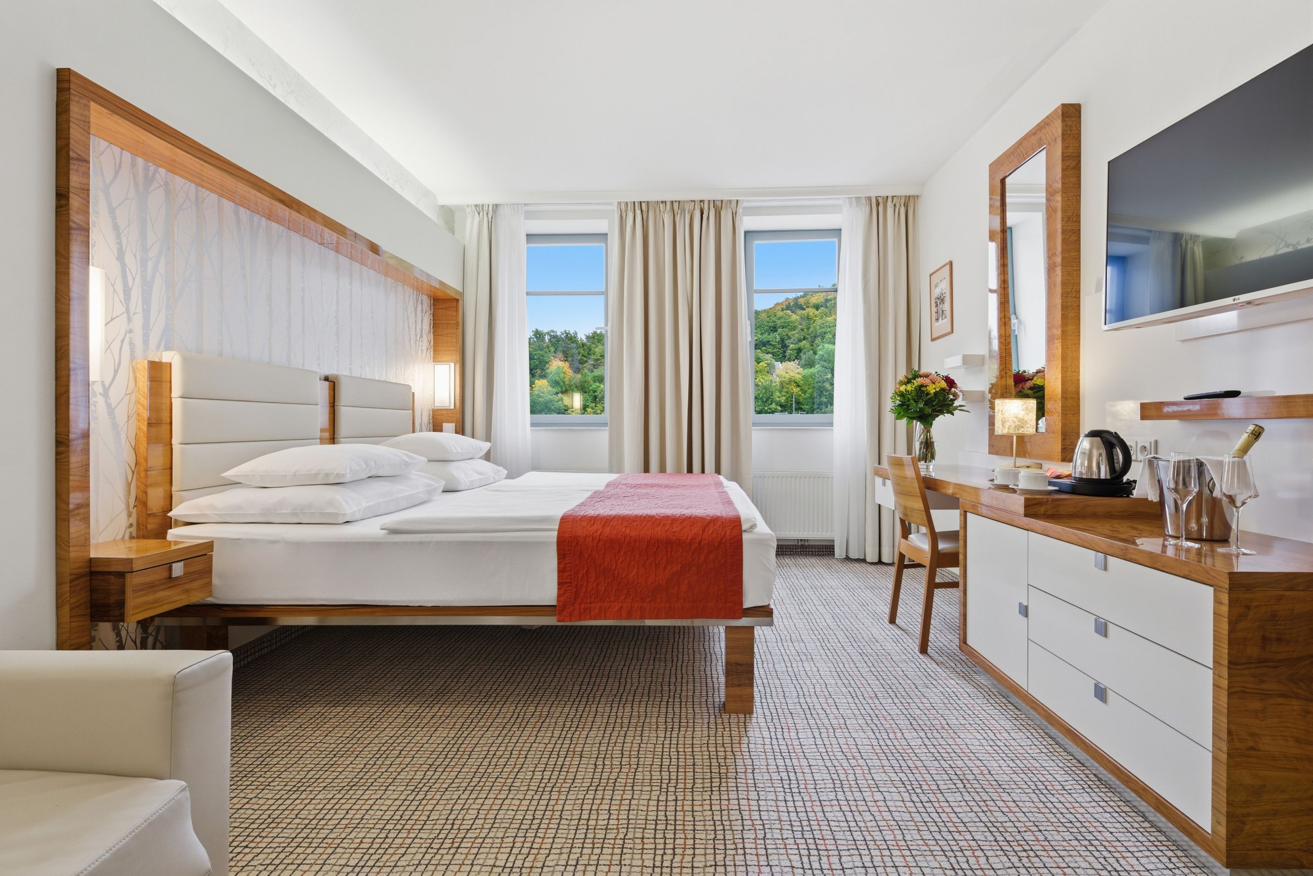 Pokoj Vista Grand doporučujeme hostům, kteří chtějí zažít lázeňský pobyt na vyšší úrovni – s větším prostorem, elegantním interiérem a nezapomenutelným výhledem.