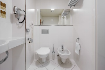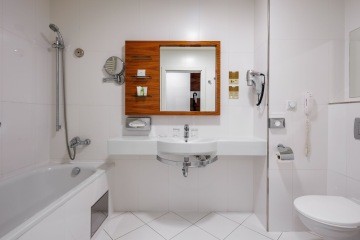 Koupelna je vybavena sprchovým koutem nebo vanou, nechybí bidet, fén, kosmetické zrcátko a vybraná kosmetika značky Nature Philosophy s vůní zeleného čaje.